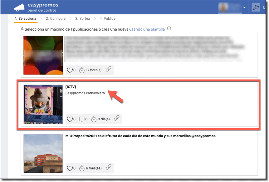 Importing comments from your Instagram video with Easypromos is pretty straightforward. Access your Easypromos account and select the Instagram Giveaway app. As usual, it will ask you to connect your Facebook account to be able to access the Facebook-Instagram API in order to pull all the comments from your post. Once you authenticate the application, you will see a list of your publications with comments and among them, including videos and Reels.