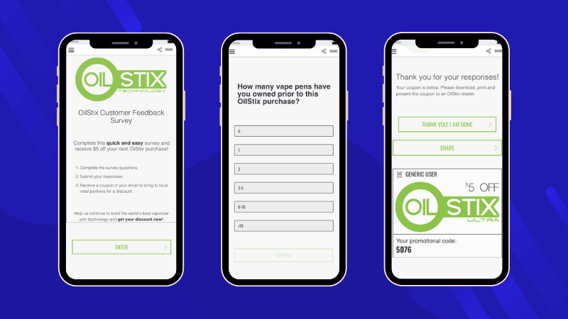 Here’s an example from a vape pen company. They offered a generous $5 discount to customers who filled out a survey. Participants were asked about their purchasing history, what kind of products they preferred, and what would motivate them to buy again. The brand collected valuable contact details, too.