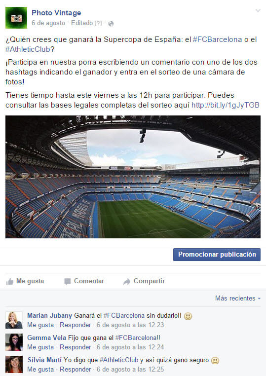 Otro tipo de sorteo es organizar una porra deportiva rápida y simple en una publicación de tu página de Facebook. Pide a los usuarios que participen escribiendo un comentario en el post, en donde indicarán su pronóstico a través de #hashtags. Una vez sepas el resultados del partido, a través de la app sorteos en Facebook de Easypromos, podrás realizar un sorteo automático entre aquellos que hayan acertado el resultado gracias al sistema de detección de hashtags. Si te interesa esta opción, aquí te lo explicamos en detalle.