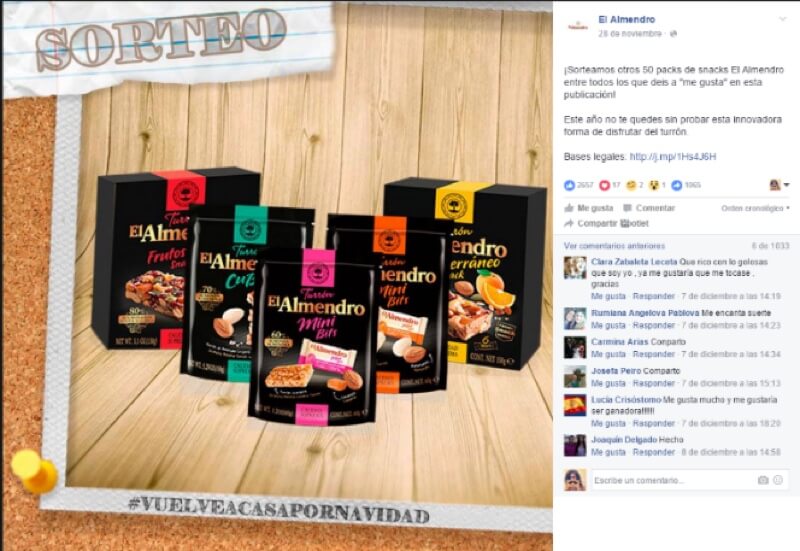 Esta famosa marca española de turrones creó un sorteo de productos exclusivos para promocionar sus innovadores packs de snacks durante la campaña de Navidad “Vuelve a casa por Navidad”. Para ello los participantes solamente tenían que darle “Me Gusta” a la publicación, llegando a más de 2.600 participantes. Además superó los 1.000 compartidos y también más de 1.000 comentarios.