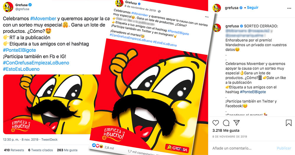 En el siguiente ejemplo te mostramos un sorteo multired de temática Movember que llevó a cabo Grefusa. Con una divertida imagen y un premio atrayente, la acción tuvo mucho éxito.