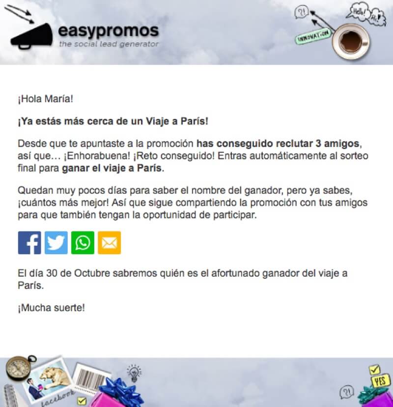 Esta comunicación fluida y directa con tus participantes ayudará a mejorar la experiencia del usuario, que le encantará recibir tus emails informándole de sus progresos. Porque, ¿a quién no le gustaría recibir un e-mail como éste?