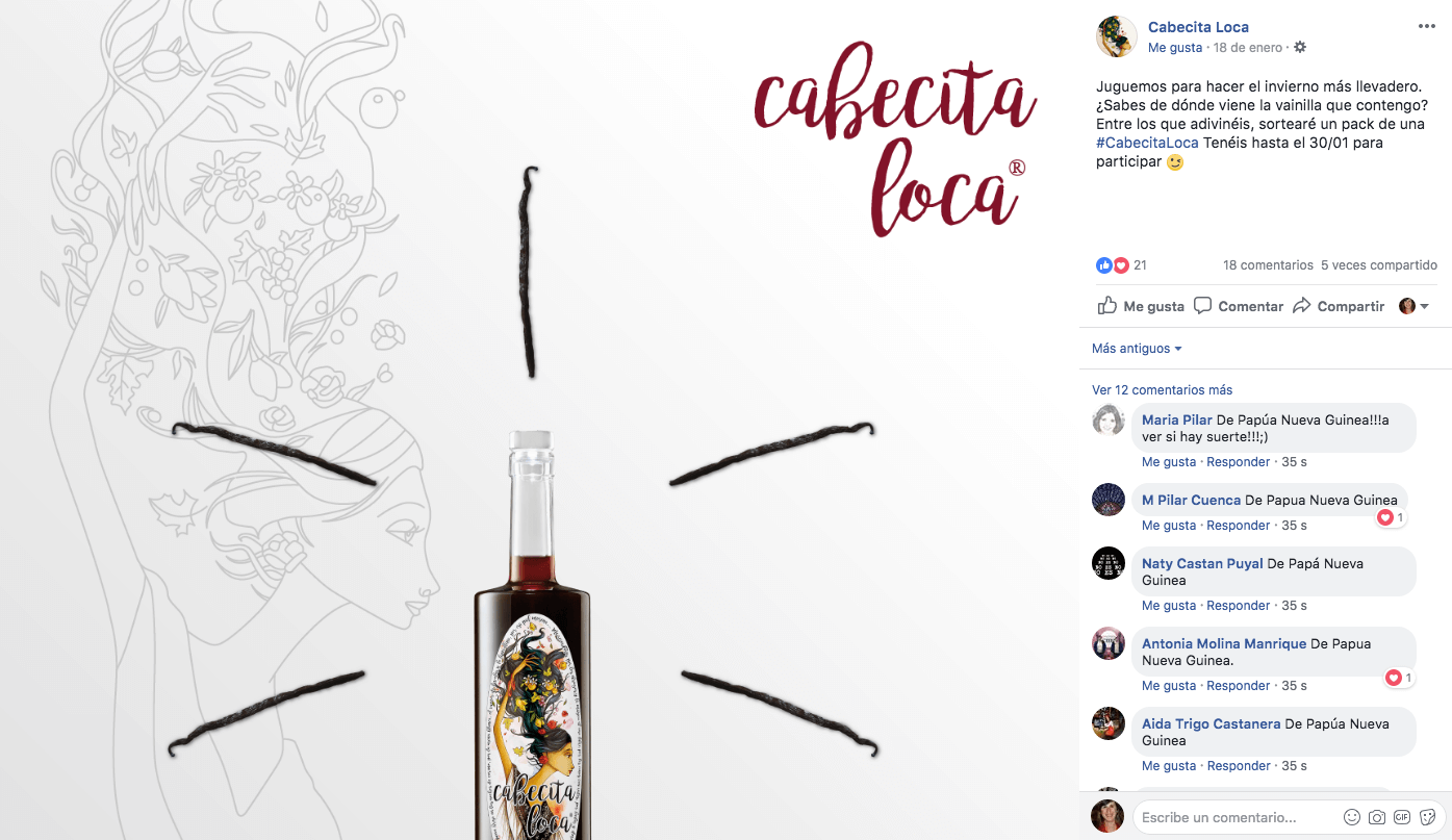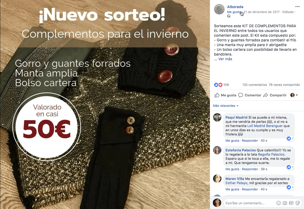 Dos aspectos que nos gusta mucho de estos sorteos: Tienen una gráfica trabajada donde se combina la temática invernal, con la presentación del producto/premio y el nombre de la acción: «sorteo» o «concurso». Además, la dinámica consiste en responder con un comentario a una pregunta abierta, lo que genera diálogo con la comunidad y respuestas de calidad. ¡Justo lo que Facebook espera de las marcas!