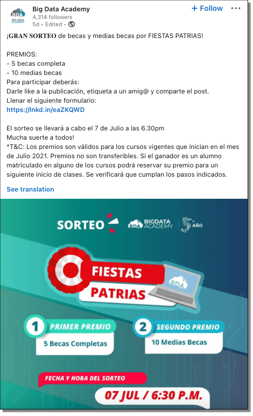 En el siguiente ejemplo vemos un sorteo en el muro de LinkedIn que pide seguir la página de la marca, darle “me gusta” a la publicación y mencionar a dos personas en los comentarios. La naturaleza de este tipo de dinámica proviene de los sorteos en Instagram, donde este tipo de promociones son más habituales y funcionan. Conseguimos más visibilidad del post y de la marca que organiza el sorteo, pero no obtendremos datos de contacto de los participantes.