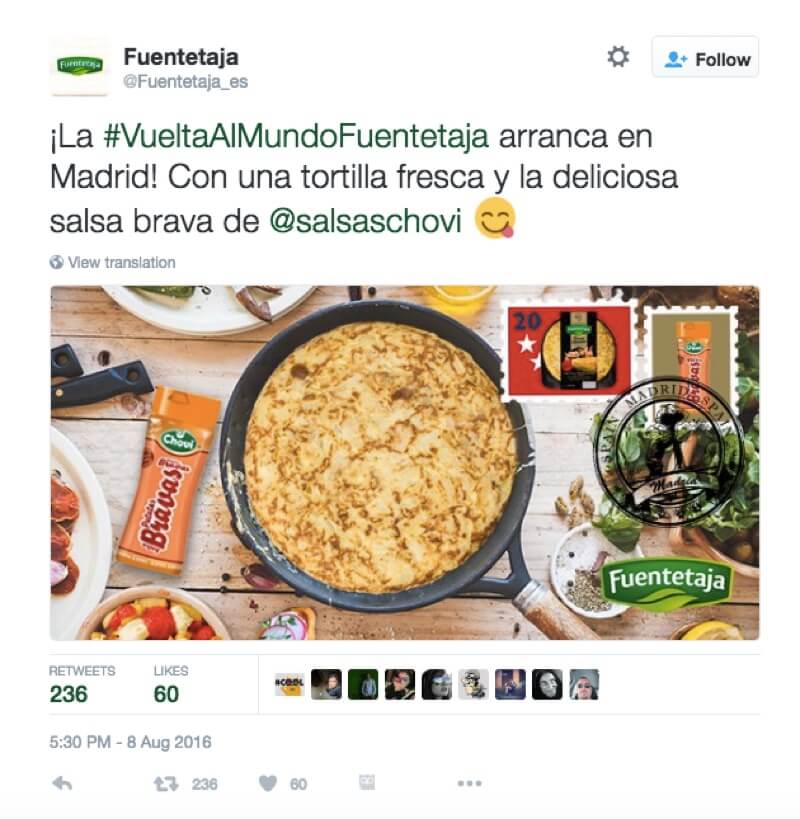 El sorteo co-branfing, que duró 12 días en Facebook y 7 días en Twitter, proponía un viaje a los seguidores de las dos marcas. Mediante creatividades en las que se combinaban uno de los productos emblemáticos de Fuentetaja (tortilla de patatas fresca) con las diferentes salsas de Choví, recreaban 7 ubicaciones distintas para ofrecer pistas del recorrido o ruta que tendrían que averiguar los usuarios. Aquellos que respondieran correctamente, entrarían en el sorteo de Facebook de 1 de los 4 fantásticos lotes de productos Fuentetaja y Choví. Utilizaron la app de sorteos en Facebook para escoger los ganadores.
